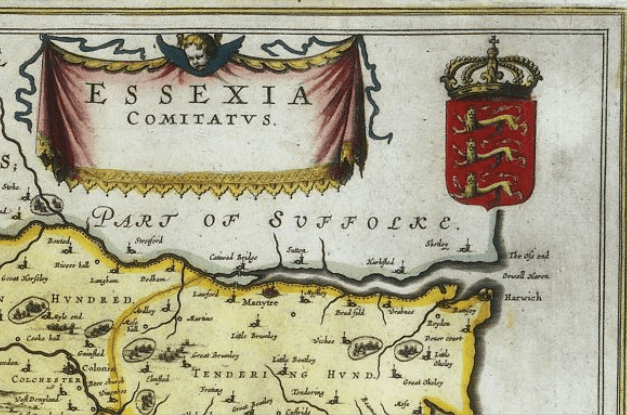 - 1640s map of Essex, England at OldMapsOnline. Closeup snapshot, Wrabness is below the “L” in Suffolke. A map of Essex county, the River divides Essex from Suffolk.