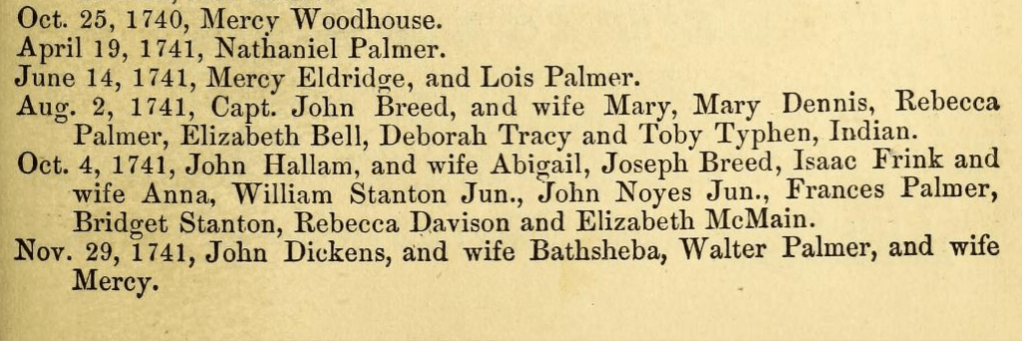 Deborah was admitted to the First Congregational Church of Stoningtonin in New London, “Admissions during the ministry of Rev. Nathaniel Eells, Full Communion Aug 2 1741 … Deborah Tracy” with others. A few weeks later, in the same church Deborah married David Dewey on September 28, 1741. Deborah and David had 11 children, all born in New London. Three sons were in the Revolutionary War: David Jr was a minuteman, Jabez died in the Battle of Harlem Heights, and Christopher was a fife-major in the War of 1812.