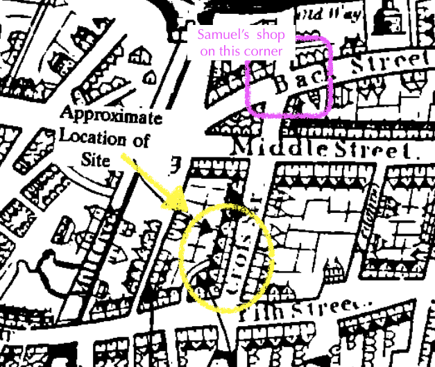 In 1996, there was an archaeological dig about 2 blocks south of Salem and Cross Streets with no specifics on Samuel Connable but some details on the area. “The heyday of artisans on these properties was between 1715 and 1780 when the properties belonged to a joiner, a pewterer, and a goldsmith”. On the map, from the dig, Cross Street is north south, Back Street also Salem Street is east west. Samuel’s shop was a block or 2 from the excavation site, marked by an arrow, image 18 of 260.