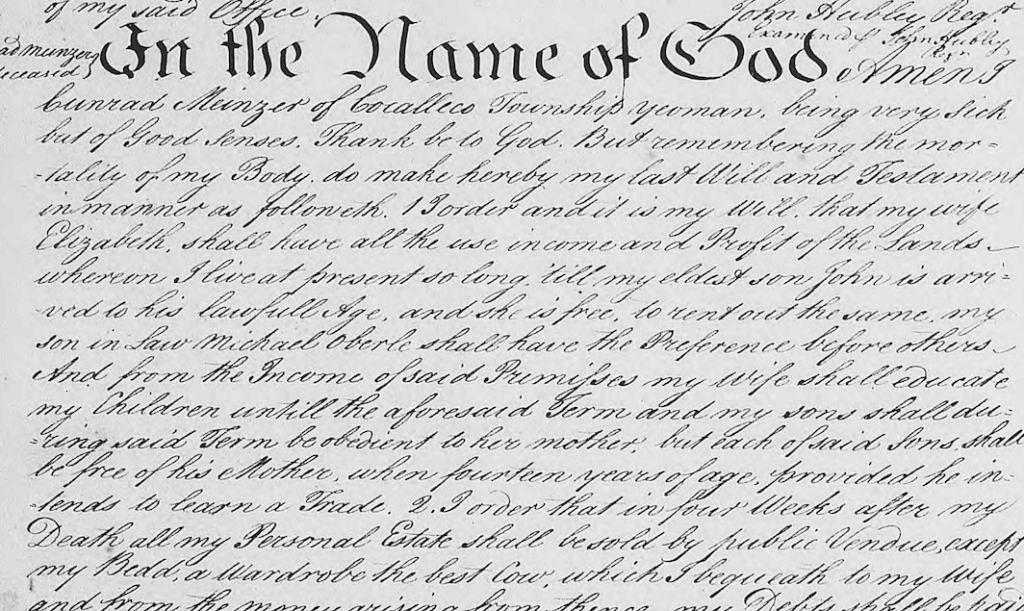 Summarized: In the name of God amen. I Conrad Meinzer being very sick but of good senses, thanks be to God. My wife Elizabeth shall have all the use and income of the lands till my eldest son John is at lawful age the same to my son in law Michael Oberle. From said income my wife shall educate my children. My sons shall be obedient to their mother but each of said sons shall be free of his mother when fourteen years of age provided he intends to learn a trade. I order that in four weeks after my death all my personal estate shall be sold except my bed, a wardrobe, the best cow which I bequeath to my wife. From the money arising my debts shall be paid and the residue shall be dispersed. All my lands shall be divided into six plots the share that I live on at present shall be appointed to my son John and the other six shares to Catharina, Anna, Maria, Verona, Frederick and Conrad until all of my heirs are made equal.