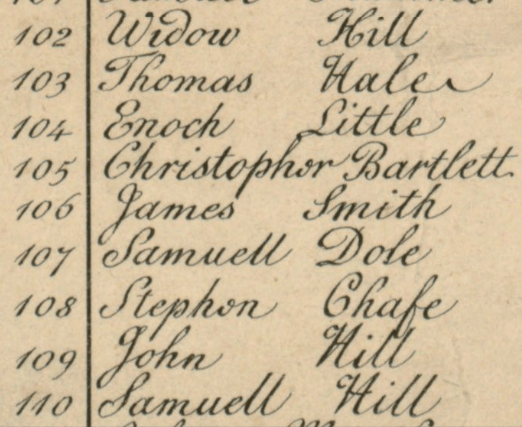 Abigail was a widow in 1732, Samuel in his will left lands to Abigail and their sons. On a map of 1729 Abigail and her sons homes are drawn, along with the rest of the town of Newbury. The house of Widow Hill is number 102, John is 109, Samuel Jr. is 110, Benjamin is 123, Joseph is 125. Abigail, John and Samuel have houses on Crane Hille Road, Benjamin and Joseph’s houses are a block or two south west on Holman Lane. The Merrimack River runs along the east edge.